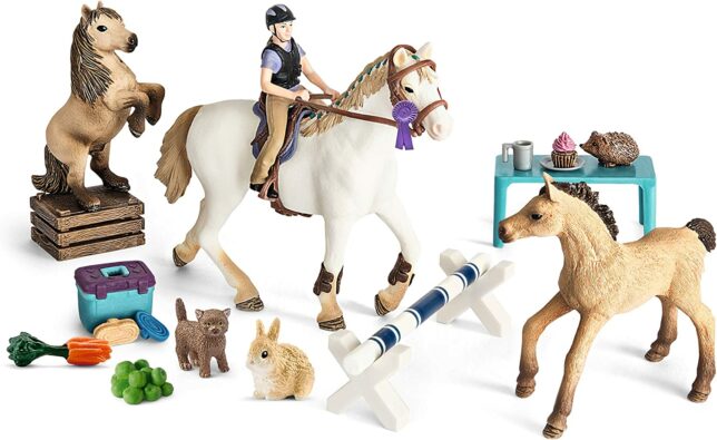 Eure Kinder werden begeistert sein, über den neuen Adventskalender „Horse Club 2018“. Ein perfektes Geschenk für die kleinen Pferdefans und Schleich-Tier-Sammler. Natürlich gibt es auch diesmal 24 Überraschungen. Die Größten sind ein steigendes Shetlandpony, eine Reiterin, ein süßes Fohlen und eine edle Araberstute. Tag für Tag gibt es mehr Figuren oder Zubehör zum Spielen.