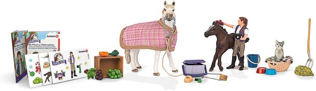 Die im Adventskalender Pferde von Schleich befindlichen Tiere sind schon auf der Verpackung toll in Szene gesetzt. Die Hauptfiguren sind ein Pferd mit Reiterin, ein Fohlen und ein graues Kätzchen. Dazu gibt es jede Menge Zubehör, welches den Spielspaß komplett macht. Pferde-Aufkleber sowie Minibücher befinden sich zusätzlich auch noch hinter dem tollen Design des Kalenders.